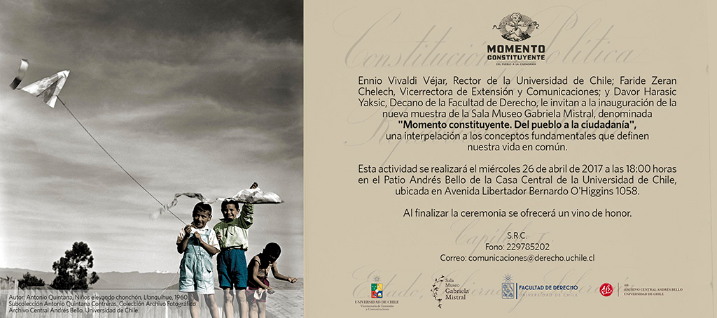 "Momento Constituyente. Del pueblo a ciudadanía" se titula la muestra que inaugurará la Casa de Bello este 26 de abril, una instalación que buscará plantear preguntas y debates en torno a los actuales procesos constitucionales a través del rescate de la historia chilena. El resultado de la exhibición responde al trabajo colaborativo entre el núcleo patrimonial de la U. de Chile, el Archivo Central Andrés Bello, y la Facultad de Derecho, junto a la colaboración del Archivo Nacional y el Senado de la República. La exhibición corresponde a la segunda instalación en la Sala Museo Gabriel Mistral, un proyecto institucional dependiente de la Vicerrectoría de Extensión y Comunicaciones que busca consolidar el carácter de apertura de la Casa Central de la Universidad a la ciudadanía.