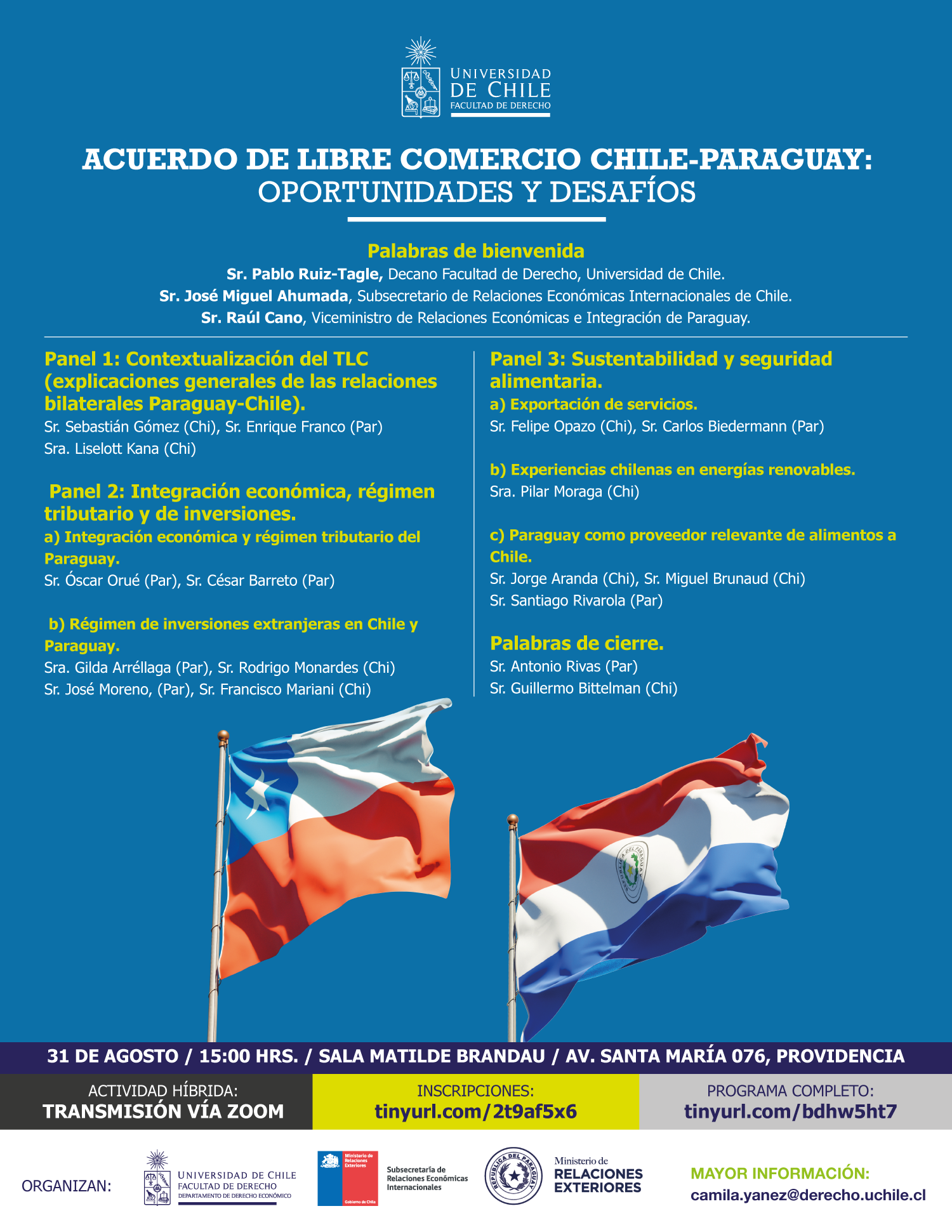 Actividad híbrida - Transmisión vía Zoom - Inscripciones online: https://tinyurl.com/2t9af5x6 - Descarga programa completo: https://tinyurl.com/bdhw5ht7 - Mayor información: camila.yanez@derecho.uchile.cl