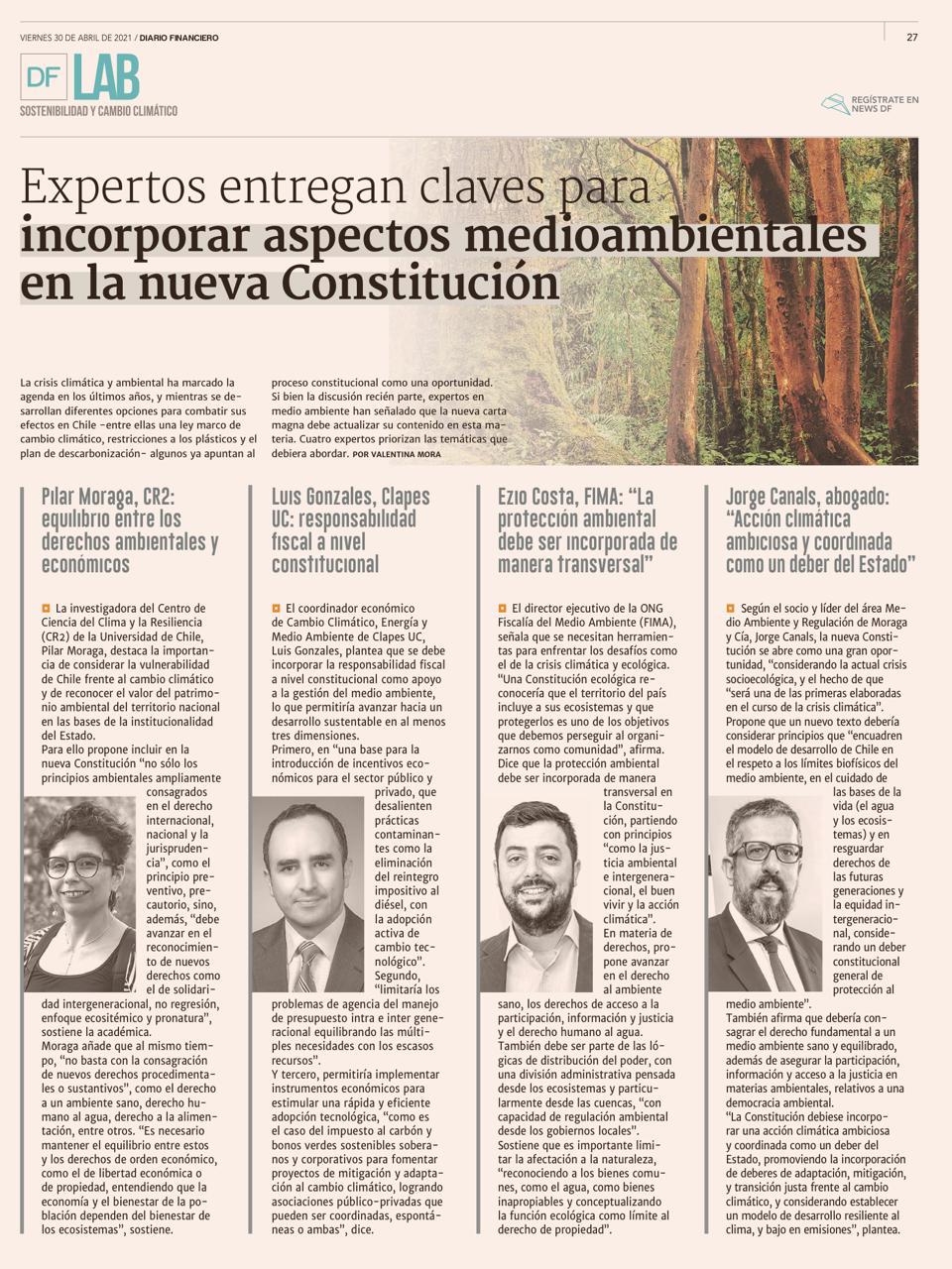 Revisa la entrevista en que participó la profesora Pilar Moraga, subdirectora e investigadora del Centro de Derecho Ambiental, publicada por el Diario Financiero, el viernes 30 de abril de 2021, en la que varios expertos en medio ambiente señalan que la nueva carta magna debe actualizar su contenido en materia de crisis climática y ambiental, y se refieren a cuáles son las temáticas que esta debiera abordar.