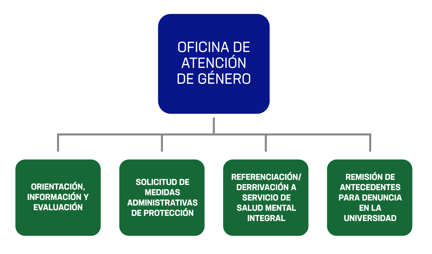 Trabajamos de manera colaborativa y coordinada con las distintas Unidades de la Facultad de Derecho y la Universidad de Chile, para asegurar el acceso a los distintos apoyos requeridos. Durante el año 2020 se establecieron los flujos de atención, dependiendo del caso que se presente en nuestra Oficina y las unidades y direcciones responsables en cada situación.