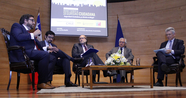 El ministro del Interior Mario Fernández, el experto español José Luis Díez Ripollés y el Decano Davor Harasic, junto al director del Departamento de Ciencias Penales, Gonzalo Medina, y al profesor Jaime Winter, fueron los encargados de cerrar el ciclo "Presente y futuro de la seguridad ciudadana", que en el transcurso de 12 seminarios analizó el escenario actual de la política penal en Chile y la tarea por delante en materia de prevención del delito.