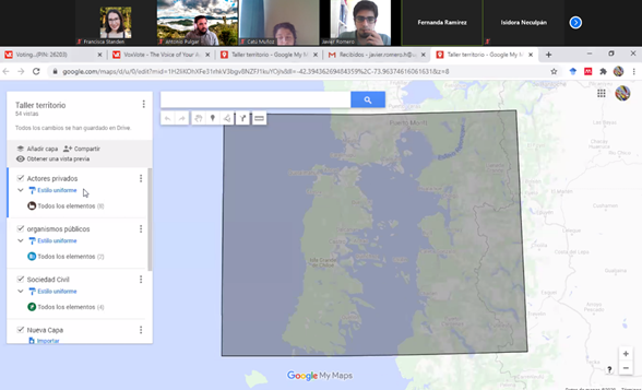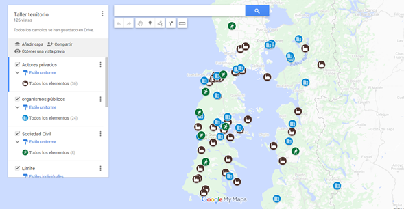 Continuó la sesión con una actividad interactiva, en la cual el grupo realizó un mapeo en la Región de Los Lagos de los diferentes actores, tanto privados, públicos, como de la sociedad civil, que conviven juntos en un mismo territorio. Se pudo concluir que muchos de los actores del territorio analizado son empresas privadas nacionales e internacionales que influyen en el territorio, y que la sociedad civil puede estar tanto en contra como a favor de ellas, así mismo los actores públicos. Es por la coexistencia de estos actores que se generan choques y conflictos en el territorio.