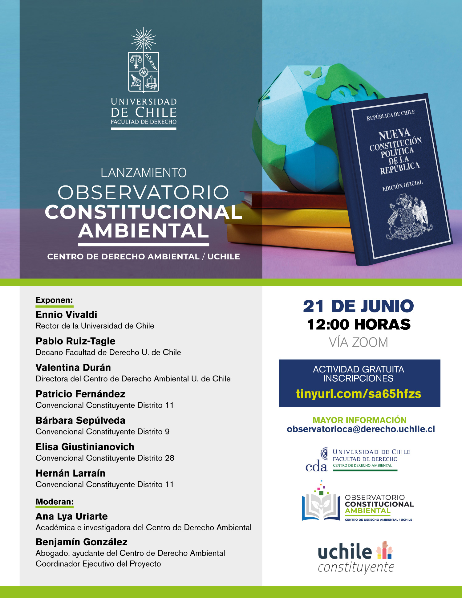 Por último, atendiendo a la importancia del proceso constitucional que el país enfrenta, y el hito académico e institucional que el Observatorio significa para la Universidad y la comunidad, se realizará una actividad de lanzamiento del Observatorio Constitucional Ambiental, el próximo lunes 21 de junio de 2021, a las 12:00 hrs., con la participación del Decano de la Facultad de Derecho de la Universidad de Chile, Prof. Pablo Ruiz-Tagle, quien abrirá el encuentro. Luego de la presentación del proyecto a cargo del equipo del CDA, habrá un conversatorio, moderado por la Prof. Ana Lya Uriarte Rodríguez, con los convencionales constituyentes Bárbara Sepúlveda (D9), Elisa Giustanovich (D28), Patricio Fernández y Hernán Larraín (D11). Finalmente, el Rector, Dr. Ennio Vivaldi, ofrecerá unas palabras de cierre.