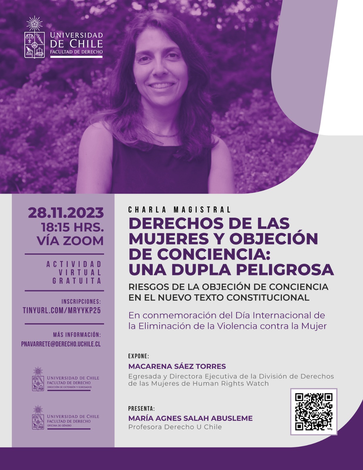 (https://tinyurl.com/MRYYKP25)Charla Magistral: Derechos de las mujeres y objeción de conciencia, una dupla peligrosa: Riesgos de la objeción de conciencia en el nuevo texto constitucional
