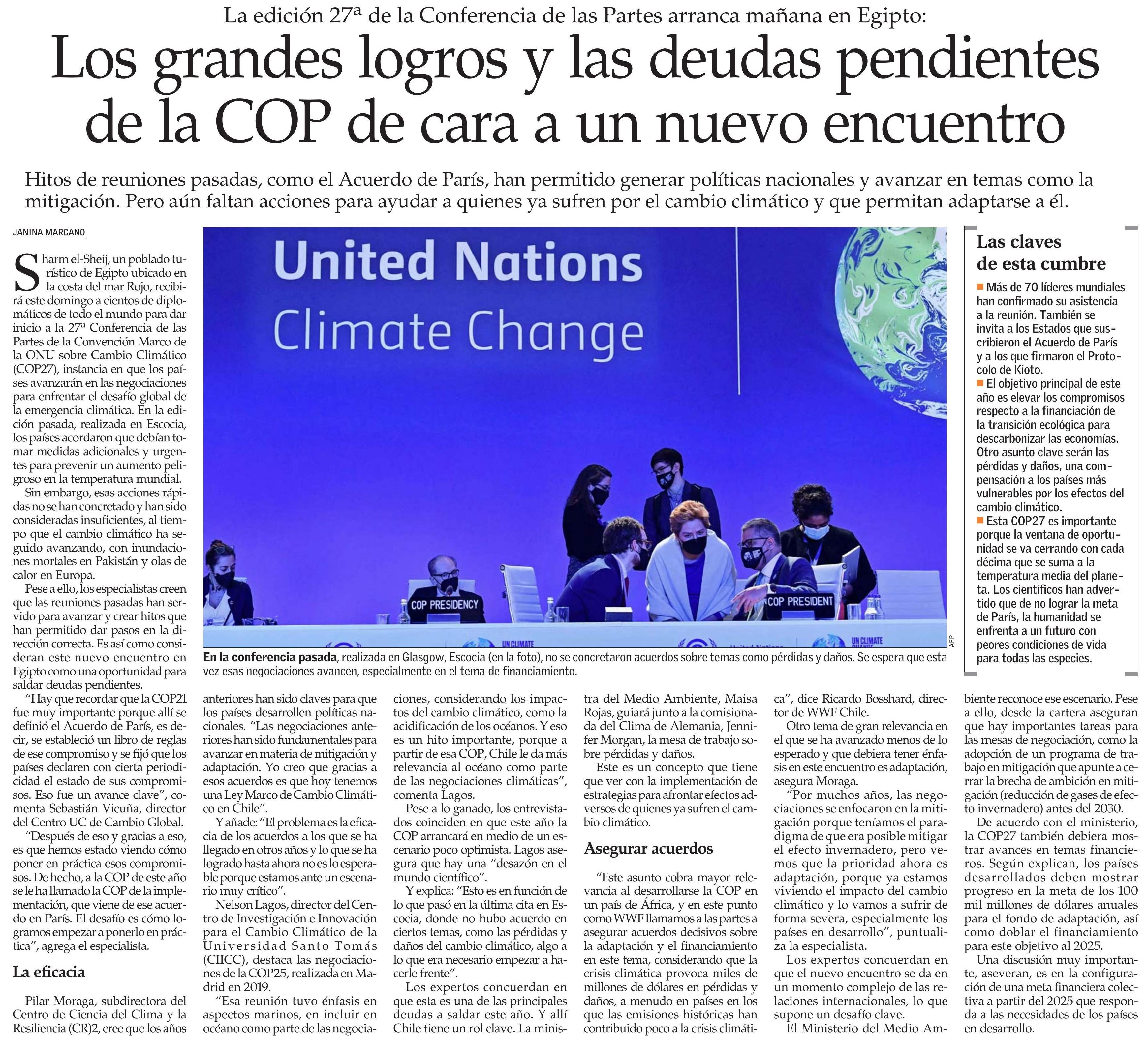 "Este asunto cobra mayor relevancia al desarrollarse la COP en un país de África, y en este punto como WWF llamamos a las partes a asegurar acuerdos decisivos sobre la adaptación y el financiamiento en este tema, considerando que la crisis climática provoca miles de millones de dólares en pérdidas y daños, a menudo en países en los que las emisiones históricas han contribuido poco a la crisis climática", dice Ricardo Bosshard, director de WWF Chile.