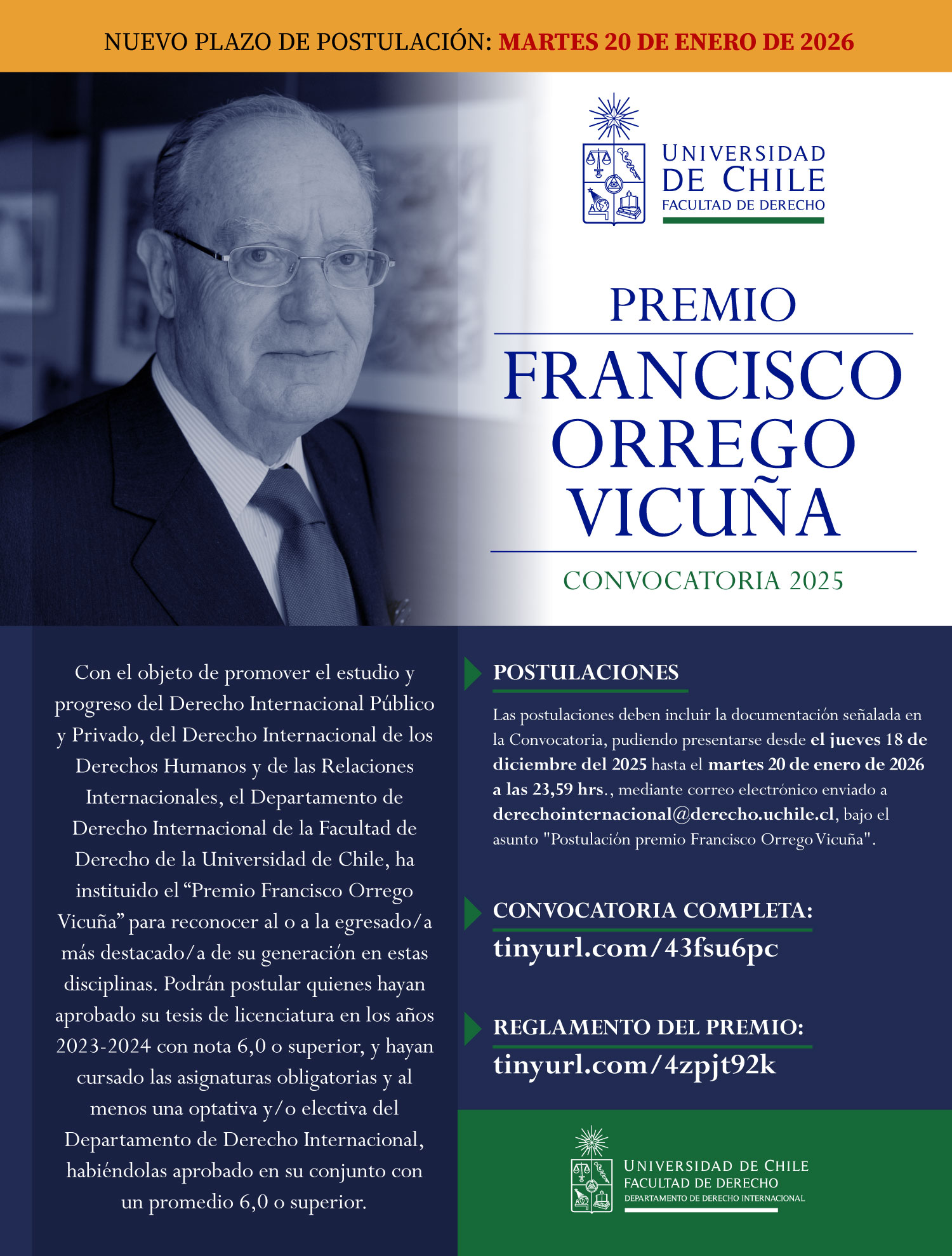 Con el objeto de promover el estudio y progreso del Derecho Internacional Público y Privado, del Derecho Internacional de los Derechos Humanos y de las Relaciones Internacionales, el Departamento de Derecho Internacional de la Facultad de Derecho de la Universidad de Chile, ha instituido el “Premio Francisco Orrego Vicuña” para reconocer al o a la egresado/a más destacado/a de su generación en estas disciplinas. Podrán postular quienes hayan aprobado su tesis de licenciatura en los años 2023-2024 con nota 6,0 o superior, y hayan cursado las asignaturas obligatorias y al menos una optativa y/o electiva del Departamento de Derecho Internacional, habiéndolas aprobado en su conjunto con un promedio 6,0 o superior.