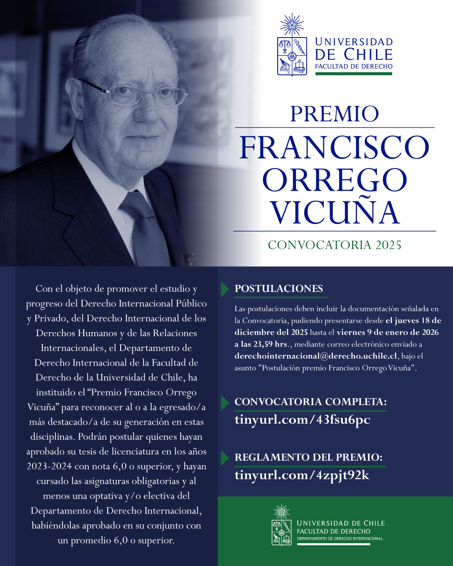 Con el objeto de promover el estudio y progreso del Derecho Internacional Público y Privado, del Derecho Internacional de los Derechos Humanos y de las Relaciones Internacionales, el Departamento de Derecho Internacional de la Facultad de Derecho de la Universidad de Chile, ha instituido el “Premio Francisco Orrego Vicuña” para reconocer al o a la egresado/a más destacado/a de su generación en estas disciplinas. Podrán postular quienes hayan aprobado su tesis de licenciatura en los años 2023-2024 con nota 6,0 o superior, y hayan cursado las asignaturas obligatorias y al menos una optativa y/o electiva del Departamento de Derecho Internacional, habiéndolas aprobado en su conjunto con un promedio 6,0 o superior.