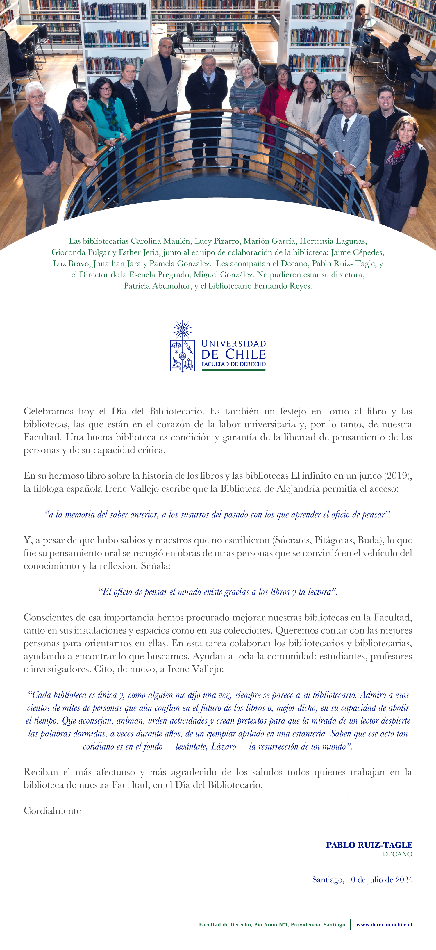“El día del Bibliotecario es también un festejo en torno al libro y las bibliotecas, las que están en el corazón de la labor universitaria y, por lo tanto, de nuestra Facultad. Una buena biblioteca es condición y garantía de la libertad de pensamiento de las personas y de su capacidad crítica”, señaló Pablo Ruiz-Tagle.