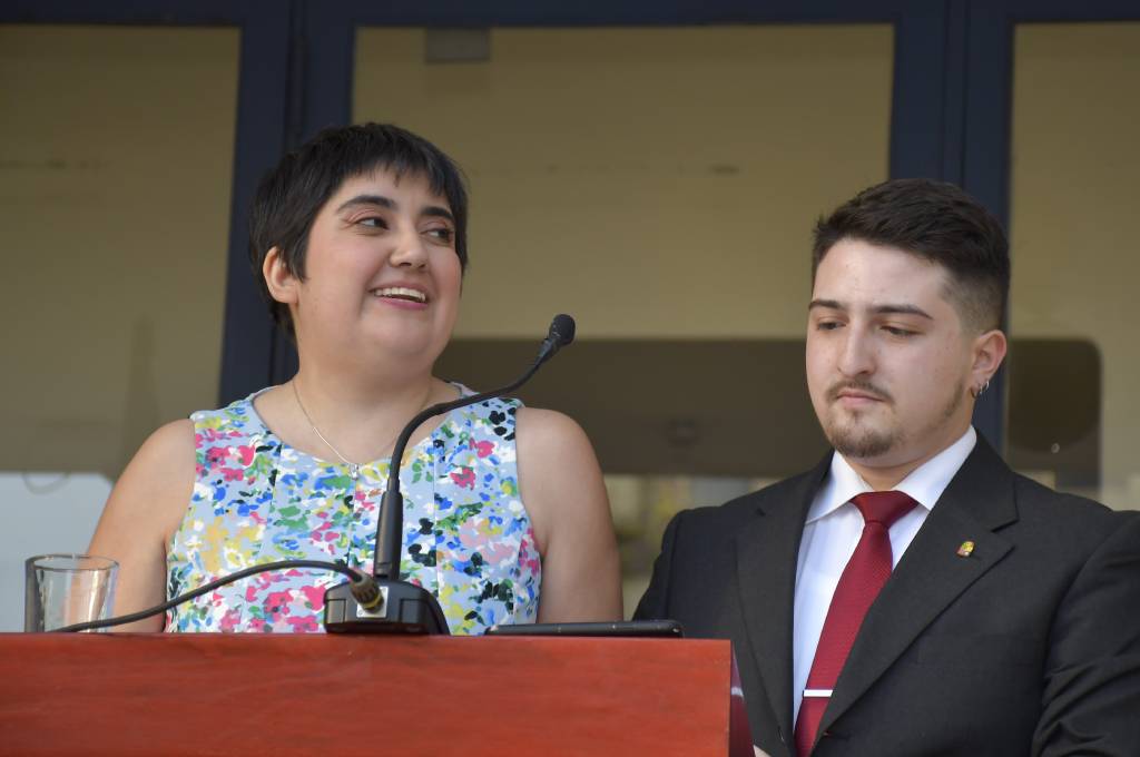 De parte de los egresados, fueron los estudiantes Isidora Martínez y Jorge Rossel quienes brindaron un discurso conjunto, en que agradecieron a las autoridades, profesores y funcionarios de la Facultad, como también a sus familias por la compañía en estos cinco años de estudio.