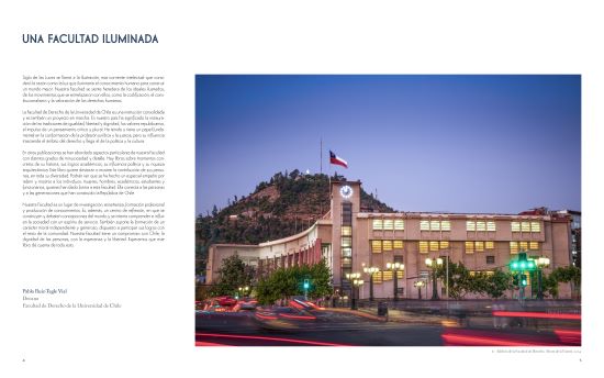 “Podrán ver que se ha hecho un especial empeño por referir y mostrara a los individuos: mujeres, hombres, académicos, estudiantes y funcionarios, quienes han dado forma a esta facultad. Ella conecta a las personas y a las generaciones que han construido la República de Chile”, señala.
