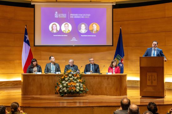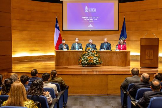 En un acto precedido por el Decano de la Facultad de Derecho de la Universidad de Chile, Pablo Ruiz-Tagle Vial, el Vicedecano (S), Francisco Agüero Vargas; el Director de la Escuela de Pregrado, Miguel González Lemus; la Subdirectora de la Escuela de Pregrado, Melissa Lineros San Martín, se realizó la entrega del Premio Facultad de Derecho 2025 a la Contralora general de Carabineros, General Inspector Karina Soza Muñoz y el Fiscal Regional de Arica y Parinacota, Mario Carrera Guerrero.