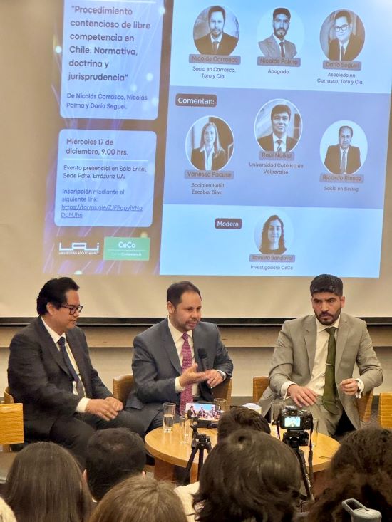 El pasado 17 de diciembre se realizó en el Centro de Competencia de la Universidad Adolfo Ibáñez el lanzamiento del libro “Procedimiento contencioso de libre competencia en Chile. Normativa, doctrina y jurisprudencia”, escrito por el profesor del Departamento de Derecho Procesal, Dr. Nicolás Carrasco Delgado, en coautoría con los abogados, egresados y ex ayudantes de nuestra Facultad, Nicolás Palma Peredo y Darío Seguel Rivas.